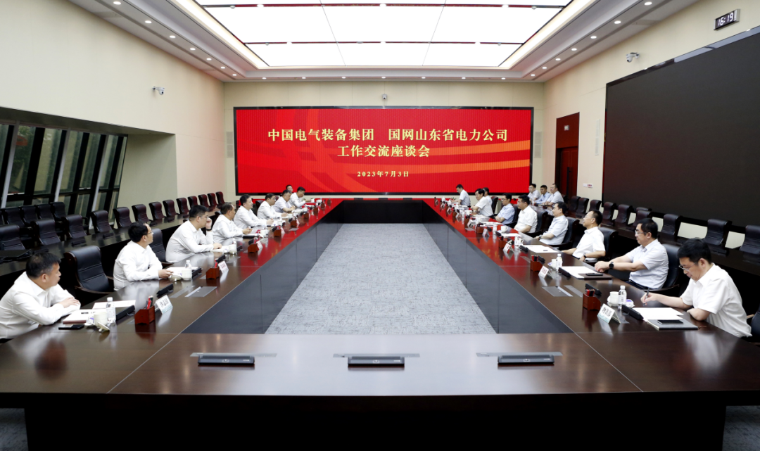 7月3日,中國電氣裝備黨委副書記、總經理周群一行拜訪國網山東電力,與國網山東電力黨委書記、董事長蔣斌,黨委副書記、總經理錢平舉行會談。雙方就深化合作、共謀發展、共贏未來進行交流。國網山東電力副總經理劉偉生、盧剛參加會談。