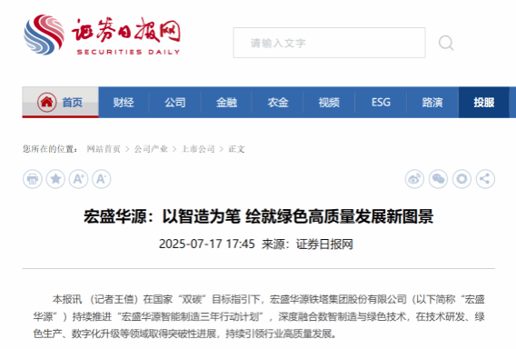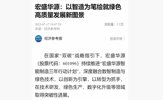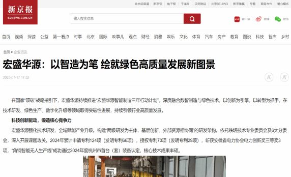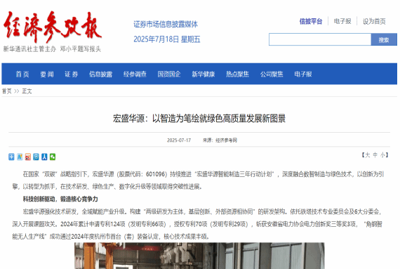 近日,新華網、新京報、中國證券報、經濟參考報等多家媒體發布文章,報道宏盛華源持續推進“智能制造三年行動計劃”,深度融合數智制造與綠色技術,在技術研發、綠色生產、數字化升級等領域取得突破性進展。