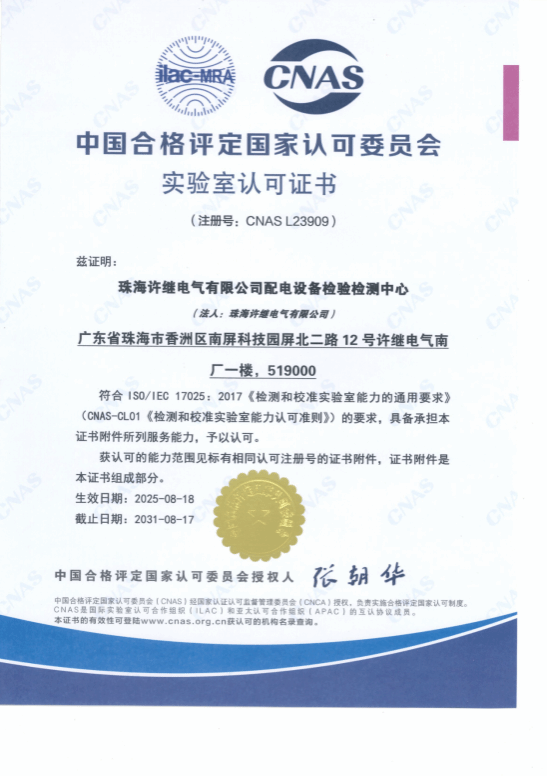 近日,許繼電氣所屬珠海許繼配電設備檢驗檢測中心順利通過中國合格評定國家認可委員會(CNAS)認可,獲得CNAS認可標識和認可證書(注冊號:CNAS L23909),標志著該中心在配電設備檢驗檢測領域的技術能力、軟硬件設施、質量管理體系及國際互認資質(方面)取得重大突破,檢驗檢測水平獲得國家權威認證。
