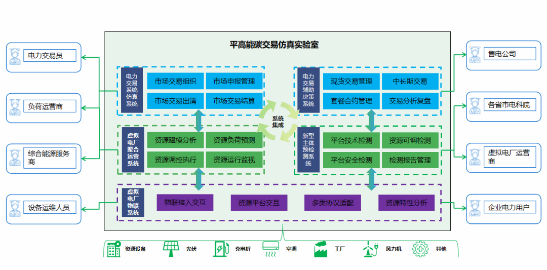 “能碳交易與仿真實驗室”面向虛擬電廠運營商與綜合能源服務商,提供從負荷管理、資源調度、接入預檢測到交易優化、碳管理與履約等全鏈條服務,依托產業鏈優勢,為工商業、公共機構等提供售電及虛擬電廠運營支持。實驗室配備源荷儲多類型高精度模擬仿真資源,同時集成虛擬電廠數據采集與聚合運營系統、新型主體預檢測系統、電力交易仿真及輔助決策系統,支持資源物聯接入、聚合調控優化、主體預檢測和交易策略優化研究,助力各類主體參與市場化交易。