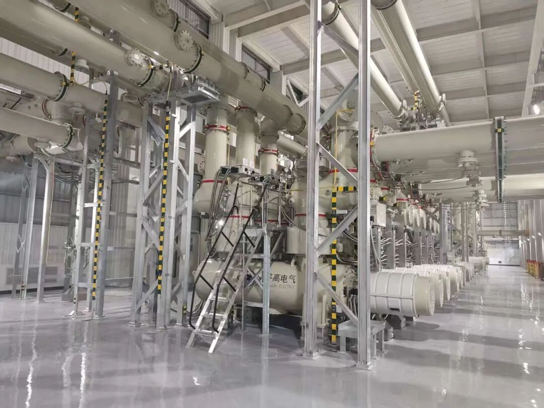 超特高壓事業部為該換流站提供33間隔550千伏GIS設備,母線長度達到7298米,GIS的主要技術性能指標均達到或超過了國內外同類先進產品的水平。為適應高原復雜環境,在GIS工程中首次應用平高電氣自主研發的高速開斷型斷路器,開斷時間≤25毫秒,可快速開斷短路電流;采用新研制的高海拔硅橡膠套管,滿足海拔3000米的環境使用要求;GIS母線殼體和導體采用分體運輸,大大減小了運輸過程中顛簸路況導致母線損傷的風險;整體采用緊湊異型設計,將全長327米的GIS室沿長度方向隨場地呈10度轉角布置,出線構架置于GIS室屋頂,交流濾波器配電裝置采用GIS形式并與GIS同層交錯布置,大量節約了設備占地面積;搭建集成風淋室、空調、貨架、攝像頭、可伸縮頂棚、空氣除濕器、環境檢測儀、智能力矩扳手的防塵棚,全過程可視化安裝,有效保障對接面安裝質量。