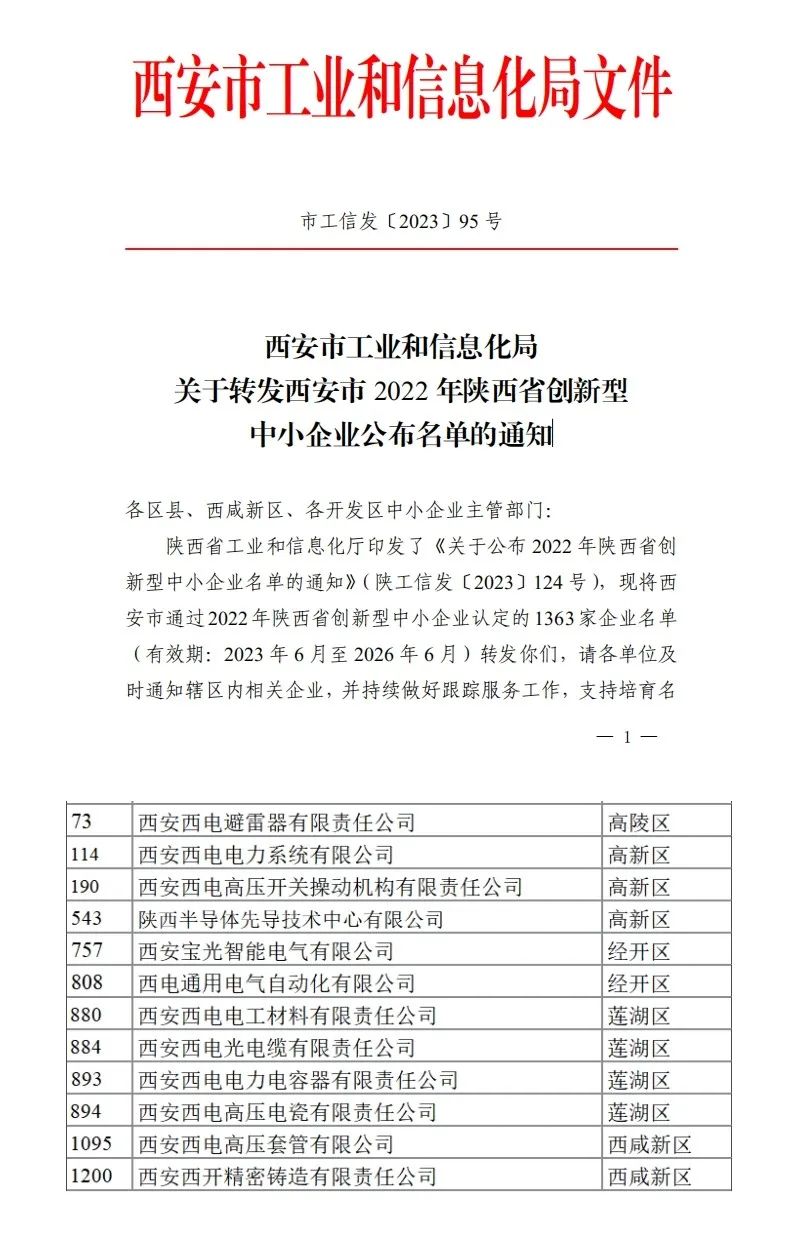 日前,陜西省工信廳印發《關于公布2022年陜西省創新型中小企業名單的通知》,文件公布了《西安市2022年陜西省創新型中小企業名單》,公司所屬西電電力系統 西電套管 西電西容西電西材西電光電纜西電避雷器西電西瓷 西電操動機構 西電通用西開鑄造 寶光智能 先導中心成功入選,被認定為2022年陜西省創新型中小企業。