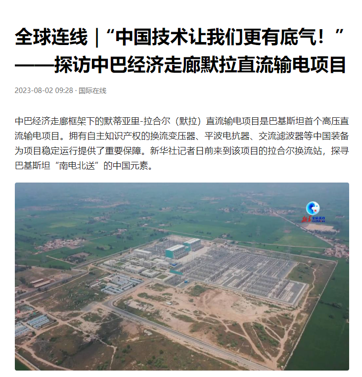 近日,新華社、新華網、今日頭條等主流媒體在重要版面、特別欄目、重點時段對中國西電推進巴基斯坦電力系統電網升級,參與“一帶一路”建設取得又一碩果予以重點關注。新華社、新華網、今日頭條等媒體先后專題報道中國西電參與建設的巴基斯坦國內第一條直流輸電工程——默蒂亞里—拉合爾±660kV直流輸電工程項目投運。報道指出,該項目有力推動了巴基斯坦電力系統實現骨干電網升級,從此邁入了交直流混聯電網新時代,也標志著中國西電參與“一帶一路”建設取得又一碩果。請跟隨鏡頭,感受一對姐妹城市的心“電”感應,探尋巴基斯坦“南電北送”中的“中國密碼”。