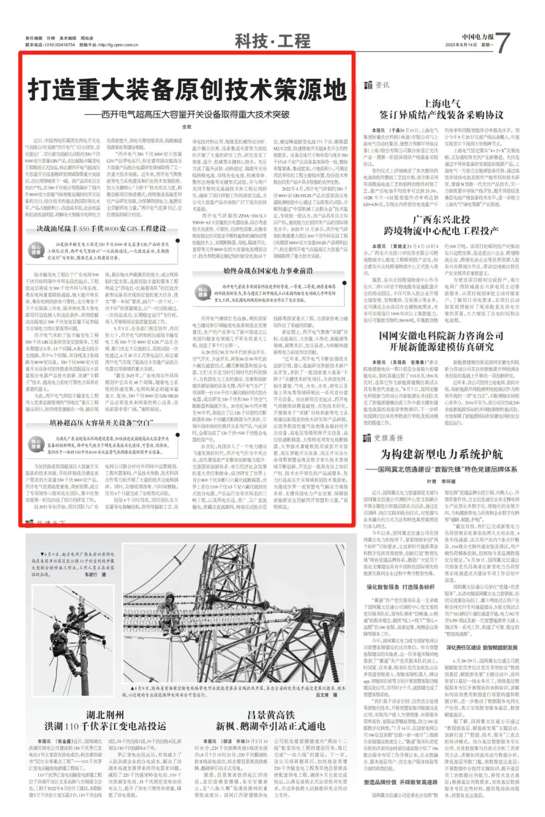 中國西電集團、中國西電將牢記“國之大者”,持續完善創新體系,激發創新活力,促進產業鏈深度融合,打造原創技術策源地,加快關鍵技術、核心產品迭代升級,推動新型電力系統建設,為建設世界一流智慧電氣裝備集團貢獻西電力量!
