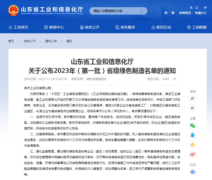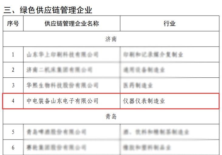 近日,山東省工業和信息化廳公示了2023年省級綠色制造名單,中電裝備山東電子有限公司(以下簡稱“山東電子”)榮獲山東省“綠色供應鏈管理企業”榮譽稱號。