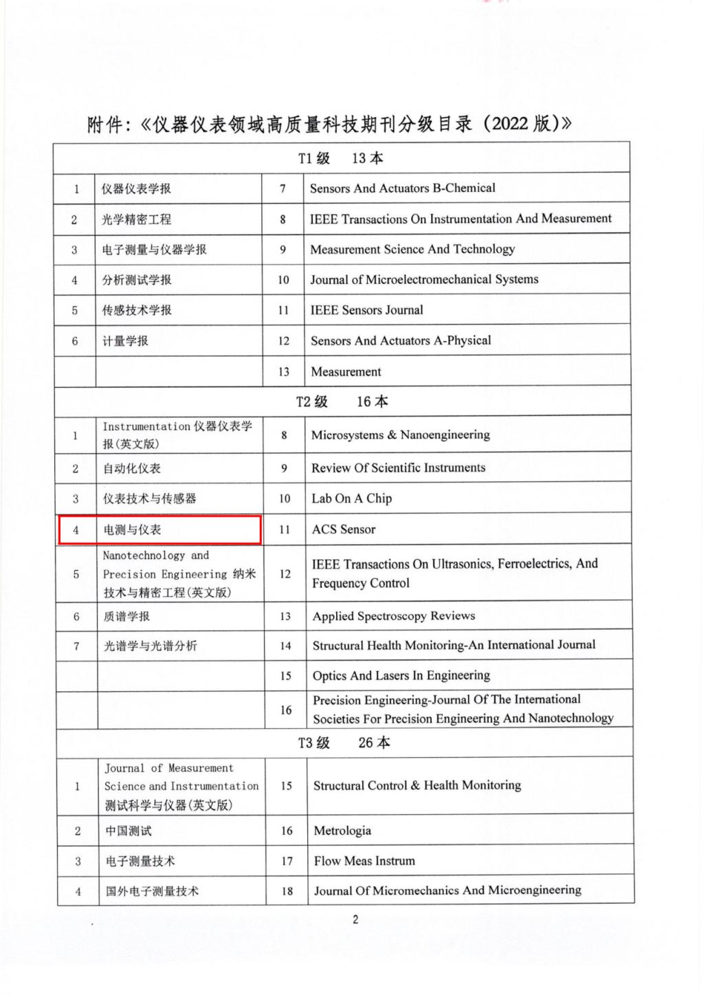 (2)2022年,《電測與儀表》首次入選《儀器儀表領域高質量科技期刊分級目錄》,并榮列T2級,排名第4位;
