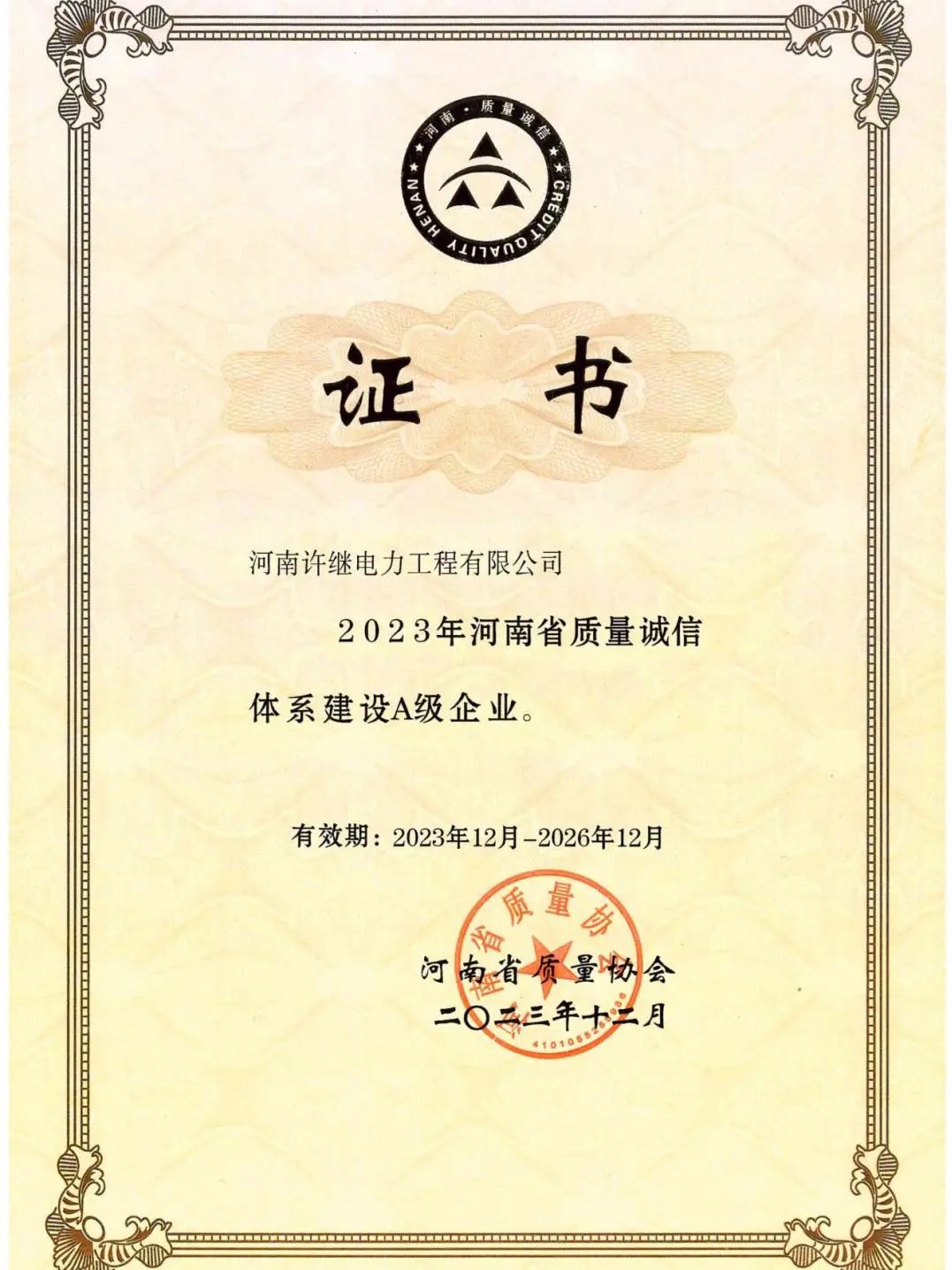 近日,河南省質量協會發布《關于公布2023年度河南省質量誠信體系建設A等企業名單的通知》,許繼集團電力工程公司成功入選2023年度質量誠信體系建設A級企業。