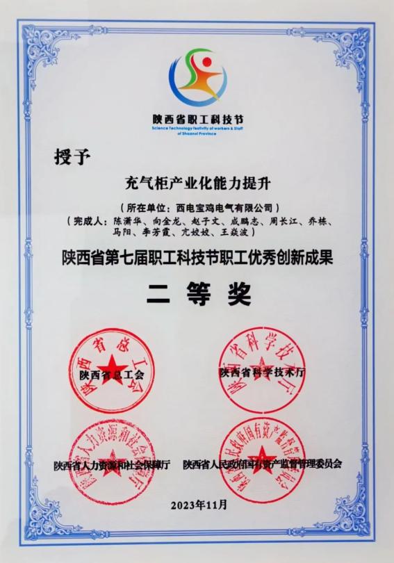 陜西省職工優秀創新成果二等獎——中國西電集團所屬西電寶雞電氣 “充氣柜產業能力提升”