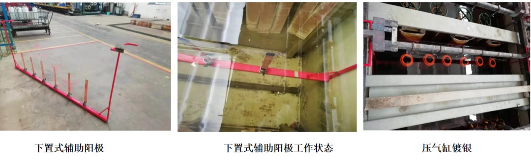 針對原輔助陽極的不足制定改善措施,利用車間閑置的不銹鋼材料焊接制作成一個新結構的輔助陽極,新輔助陽極整體布置在鍍槽底部,可以夾裝6塊銅板、銀板,鍍銅、鍍銀過程中通過輔助陽極上銅板、銀板的電解,并及時補充壓氣缸內腔溶液中消耗的銅離子、銀離子,保證了壓氣缸內腔電鍍溶液成分的穩定。經過近一個月的生產驗證,采用新結構的輔助陽極生產的壓氣缸內腔鍍層外觀良好,無發黑、起黑點等問題,零件熱震無起泡,滿足了百萬伏零件質量要求。