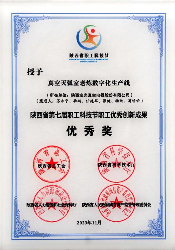陜西省職工優秀創新成果優秀獎——中國西電集團所屬寶光股份 “真空滅弧室老煉數字化生產線”