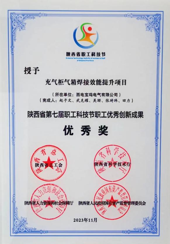 陜西省職工優秀創新成果優秀獎——中國西電集團所屬西電寶雞電氣“充氣柜氣箱焊接效能提升項目”