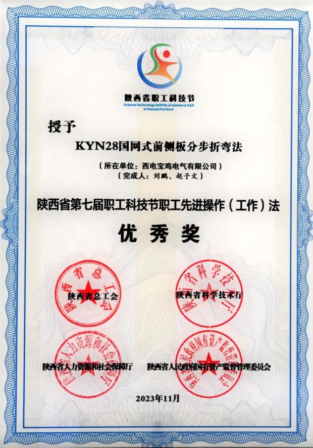 陜西省職工先進操作(工作)法優秀獎——中國西電集團所屬西電寶雞電氣“KYN28國網式前側板分步折彎法”