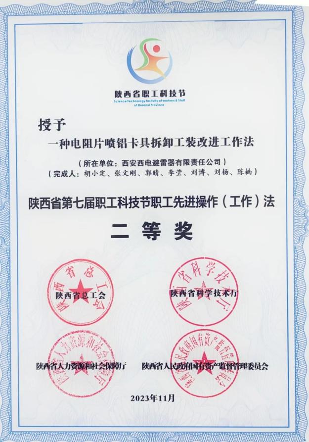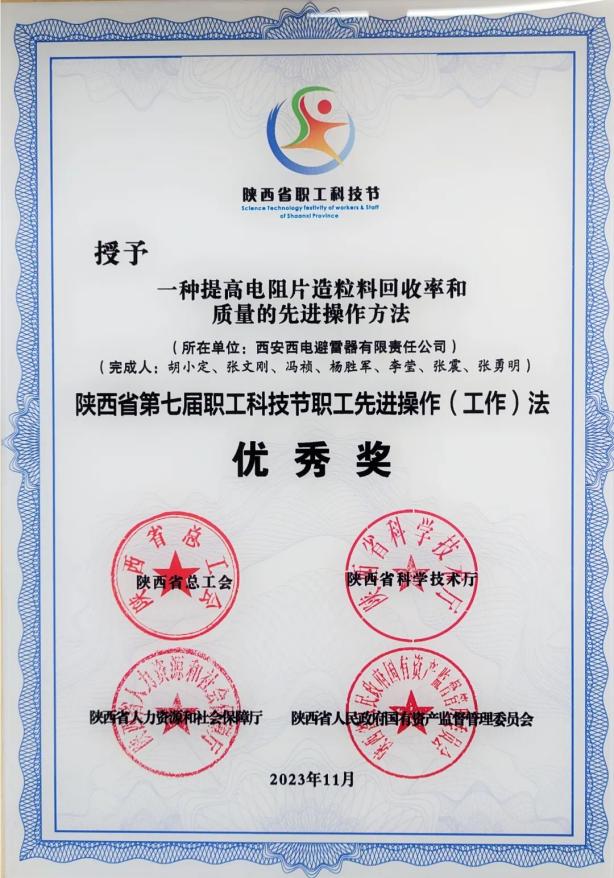 陜西省職工先進操作(工作)法優秀獎——中國西電所屬西電避雷器“一種提高電阻片造粒料回收率和質量的先進操作方法”