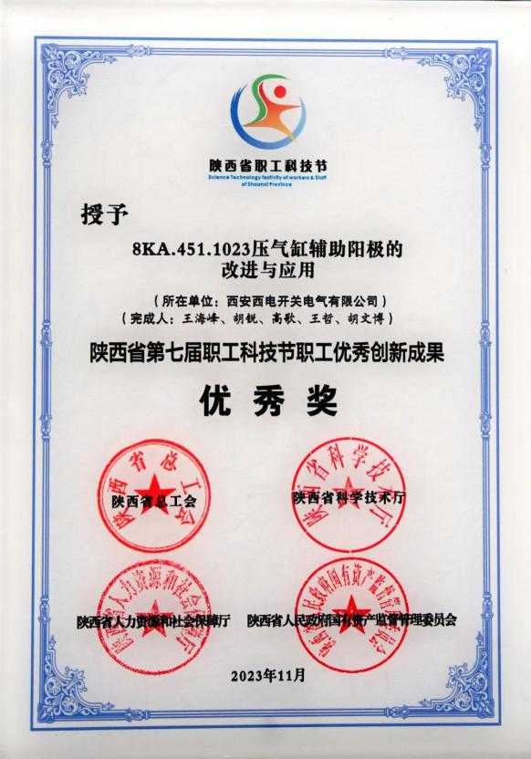 陜西省職工優秀創新成果優秀獎——中國西電所屬西開電氣“8KA.451.1023壓氣缸輔助陽極的改進與應用”