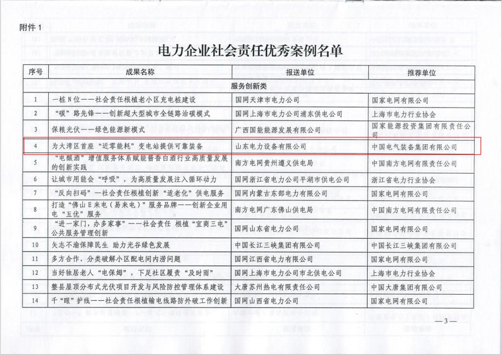 近日,2023年度電力企業社會責任優秀案例名單發布,山東電工電氣2個案例從300項案例中脫穎而出,獲評2023年度電力企業社會責任優秀案例。