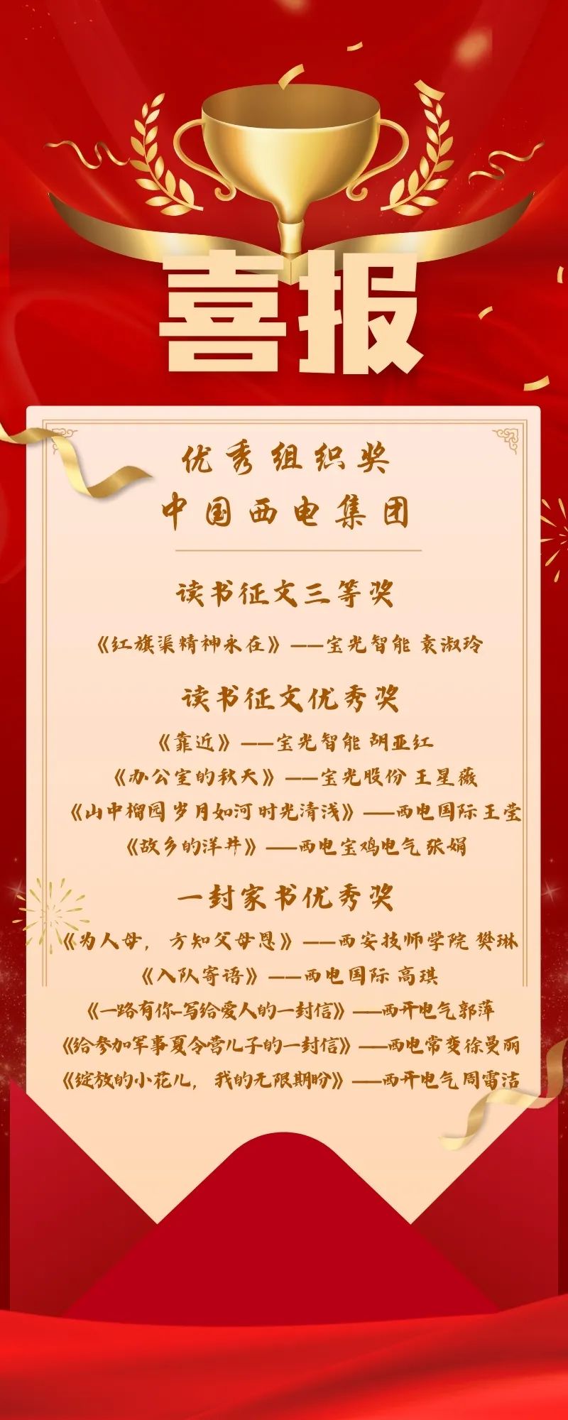 近日,以“閱讀新時代·鑄就新輝煌”為主題的第十一屆“書香三八”讀書活動獲獎作品揭曉,中國西電集團工會榮獲優秀組織獎,10個作品受到組委會表彰,這是西電集團連續八年參加全國“書香三八”讀書活動并獲獎。