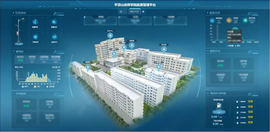 該項目是平高集團承建的首個微型碳中和示范性學院項目,通過能源管控系統和能源物聯網等綜合能源核心產品在高校的應用,開展屋頂分布式光伏、智慧路燈、智慧充電、全電廚房等建設,建成綜合能源仿真實訓平臺,在滿足低碳用能的同時降低學院能耗支出,助力學校相關學科專業建設。通過項目建設,為學院電氣、通信等專業學生打造教學示范、業務模擬、實踐操作等功能的實訓基地。