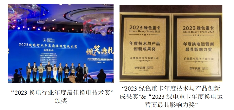2023年12月23日,許繼攜智能重卡換電站入圍由中國充電樁網與充換電百人會聯合主辦的“2023中國換電行業年度品牌”評選,榮獲“2023換電行業年度最佳換電技術獎”;入圍中國電車資源主辦的“中國新能源物流車2023綠色城配&綠色重卡年度品牌”評選,榮獲“2023綠色重卡年度技術與產品創新成果獎”和“2023綠電重卡年度換電運營商最具影響力獎”。