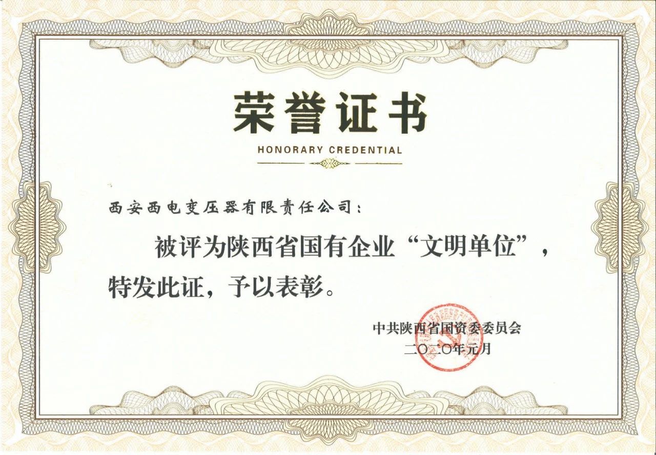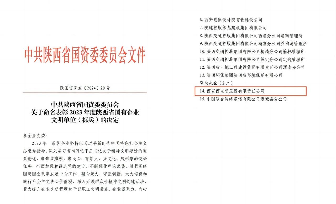 近日,陜西省國資委命名表彰了2023年度陜西省國有企業文明單位(標兵),中國西電所屬西電西變順利通過2023年度復評審核,繼續保留“陜西省國有企業文明單位”榮譽稱號。