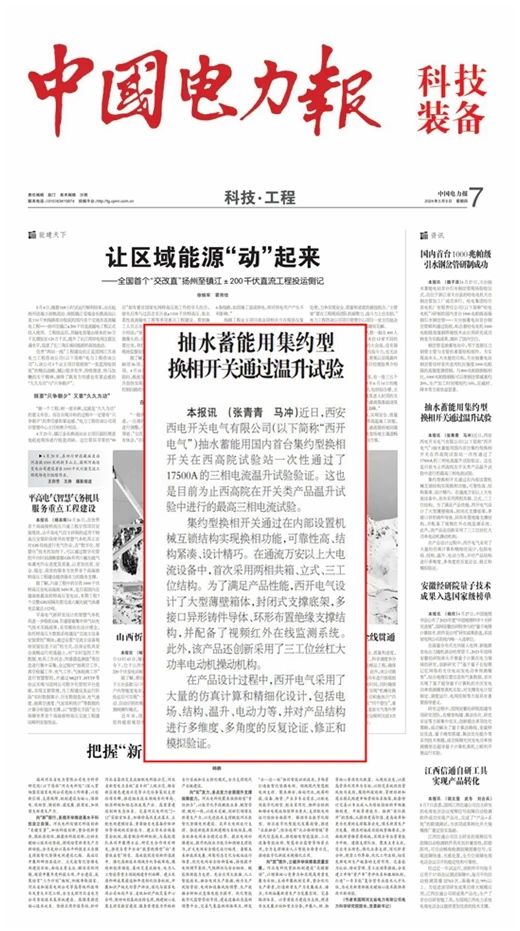 近日,西開電氣抽水蓄能用集約型換相開關一次性通過溫升試驗。17500A的三相電流溫升試驗驗證。這也是目前為止西高院在開關類產品溫升試 驗中進行的最高三相電流試驗。集約型換相開關通過在內部設置機 械互鎖結構實現換相功能,可靠性高、結 構緊湊、設計精巧。在通流萬安以上大電 流設備中,首次采用兩相共箱、立式、三工 位結構。為了滿足產品性能,西開電氣設 計了大型薄壁箱體,封閉式支撐底架,多 接口異形鑄件導體、環形布置絕緣支撐結 構,并配備了視頻紅外在線監測系統。此外,該產品還創新采用了三工位絲杠大 功率電動機操動機構。在產品設計過程中,西開電氣采用了 大量的仿真計算和精細化設計,包括電 場、結構、溫升、電動力等,并對產品結構 進行多維度、多角度的反復論證、修正和 模擬驗證。