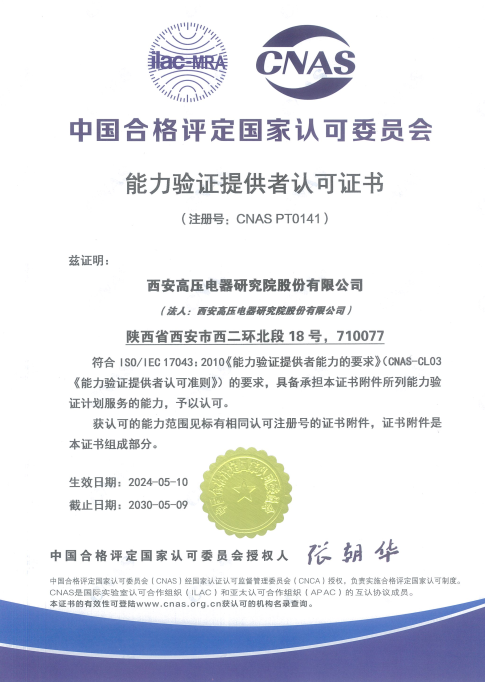 近日,中國西電所屬西高院成功獲得符合ISO/IEC 17043(CNAS-CL03)的能力驗證提供者CNAS認可資質(注冊號:CNAS PT0141)。該資質是一項國際互認的重要認證,旨在為檢驗檢測機構提供技術能力評價服務。西高院可提供的能力驗證范圍包括回路電阻、工頻電壓試驗能力驗證共計2個項目/參數。