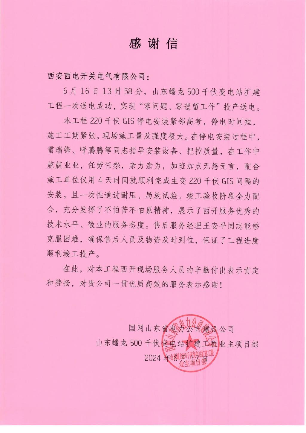 在山東蟠龍500千伏變電站擴建工程中,西開電氣僅用4天時間就順利完成了主變220千伏 GIS間隔的安裝,并一次性通過了耐壓和局放試驗。他們的高效作業和敬業精神為項目的順利投產送電提供了堅實保障,充分展示了西開電氣卓越在技術和服務方面的卓越實力。