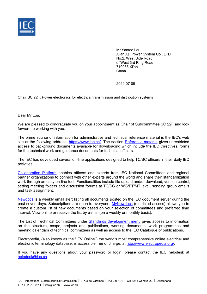 近日,從國際電工委員會(IEC)傳來喜訊,西電電力系統董事長婁彥濤當選IEC TC22 SC22F(電力電子系統和設備技術委員會輸配電系統電力電子技術分技術委員會)主席。這是西電人連續三次擔任IEC TC22 SC22F主席職位,是公司國際電工標準化工作的重要突破,展現了西電在直流輸電領域標準化建設方面的突出成績和重大貢獻,更體現了西電及我國在國際標準舞臺的影響力和話語權。