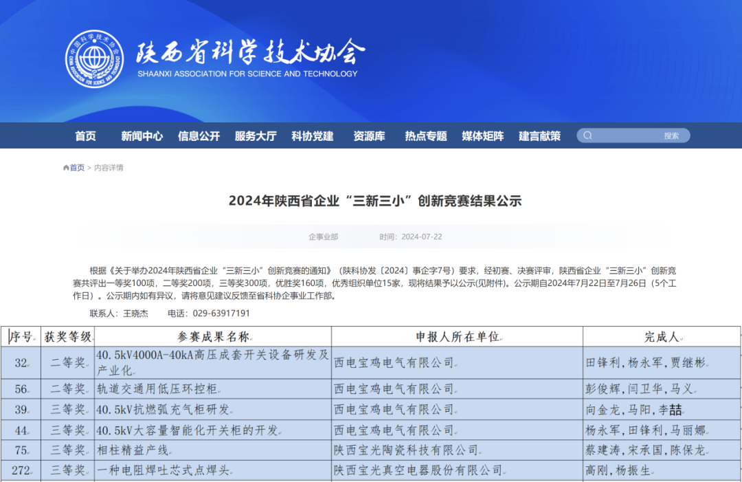 近日,在2024年陜西省企業“三新三小”創新競賽大會上,中國西電集團所屬寶光集團所屬西電寶雞電氣參賽的“40.5kV4000A-40kA高壓成套開關設備研發及產業化、軌道交通用低壓環控柜”榮獲二等獎;“40.5kV抗燃弧充氣柜研發及40.5kV大容量智能化開關柜的開發”榮獲三等獎;所屬寶光股份參賽的“一種電阻焊吐芯式點焊頭、相柱精益產線”榮獲三等獎。此次獲獎是對寶光集團科技研發水平及成果轉化應用的又一次高度肯定和認可,同時也是對寶光集團在創新發展道路上的激勵和鞭策。