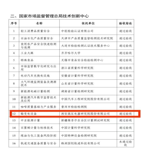 近日,國家市場監督管理總局下發《市場監管總局辦公廳關于公布2021年批準建設的國家市場監督管理總局重點實驗室和技術創新集中驗收結果的通知》,西高院籌建的“國家市場監督管理總局技術創新中心(輸變電設備)”(以下簡稱技術創新中心)順利通過總局驗收并進入正式運行序列。