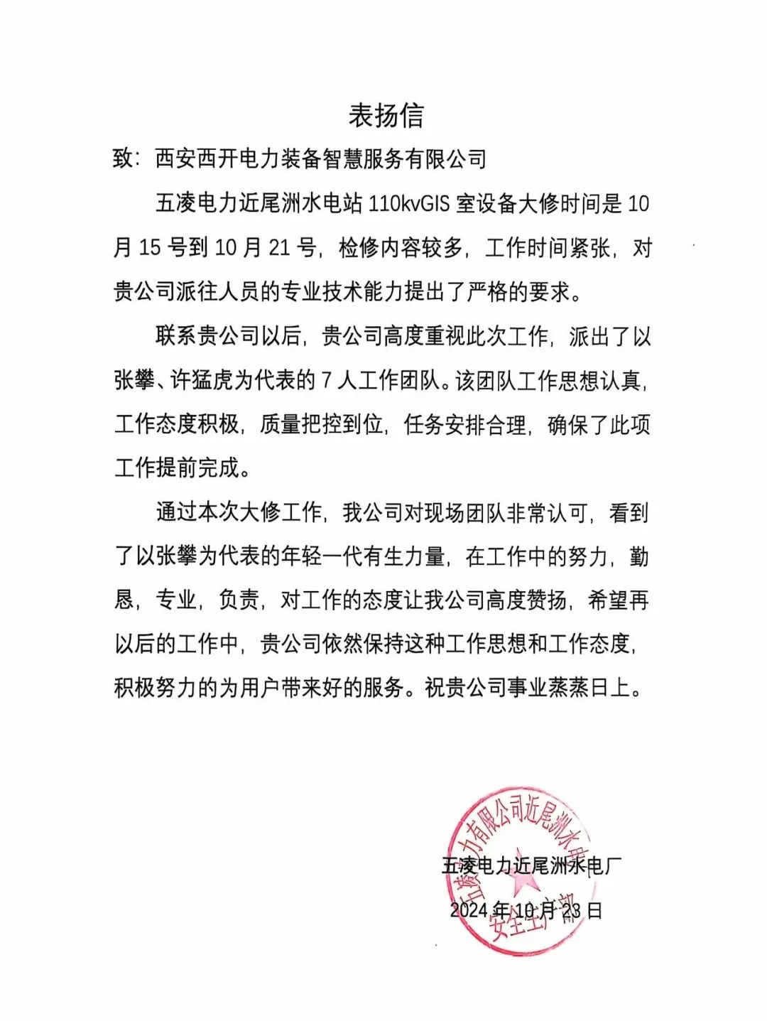 近日,中國西電所屬西開電氣收到了來自五凌電力近尾洲水電站一封深情厚誼的感謝信。信中,五凌電力對西開電氣在110kVGIS產品大修項目中所展現出的卓越能力和敬業精神表達了由衷的感謝和高度贊揚。