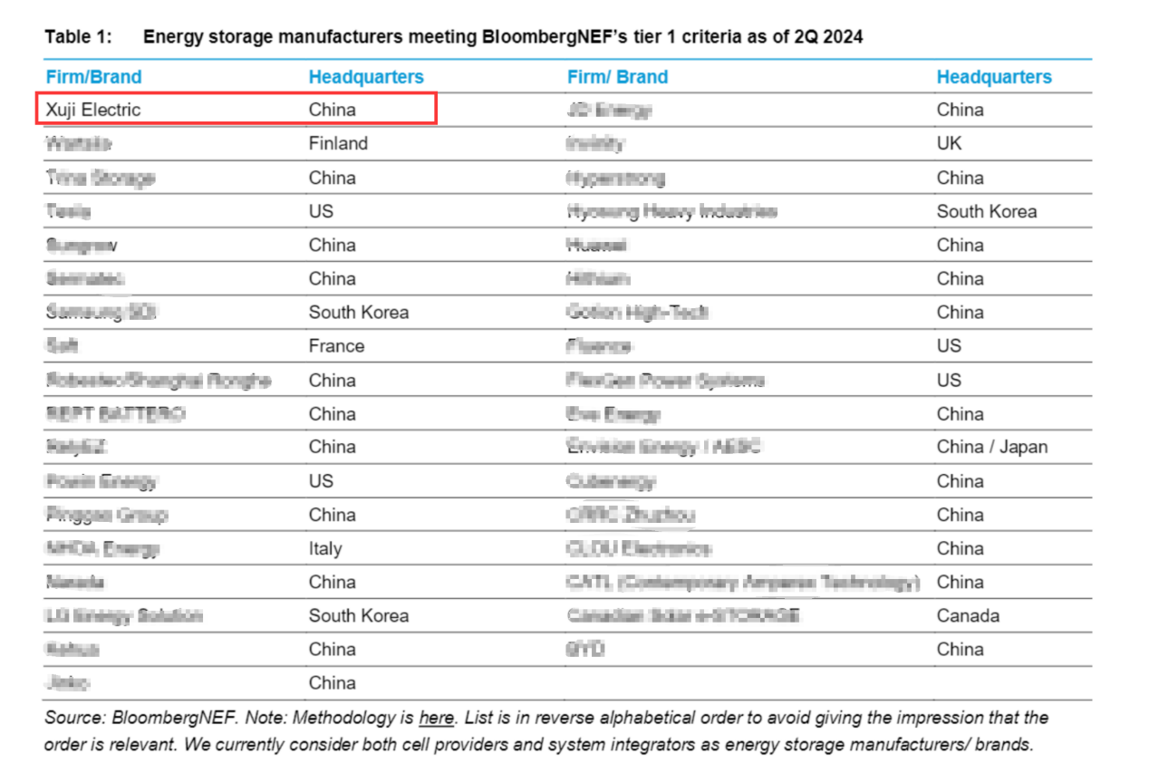 近日,全球知名研究機構彭博新能源財經(BloombergNEF–BNEF)官宣發布2024年第二季度全球一級儲能廠商榜單Tier 1《《BNEF Energy Storage Tier 1 List 2Q 2024》》,許繼電氣憑借在儲能領域雄厚實力榮登榜單!