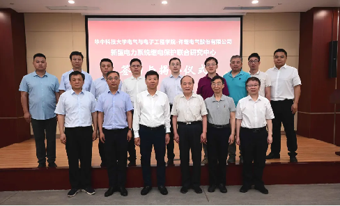 許繼電氣黨委副書記、總經理許濤與中國科學院院士程時杰共同為聯合研究中心揭牌。許繼電氣黨委委員、副總經理樊占峰與華中科技大學電氣電子工程學院副院長方家琨代表雙方簽訂共建協議。華中科技大學校長助理文勁宇參加儀式并致辭。
