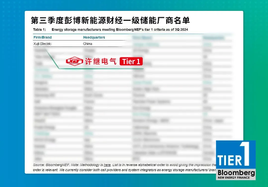 近日,全球知名研究機構彭博新能源財經(BNEF)發布2024年第三季度全球Tier1一級儲能廠商榜單(BNEF Energy Storage Tier 1 List 3Q 2024),許繼電氣憑借高效可靠的儲能產品、卓越的技術和雄厚的企業實力,在競爭激烈的儲能廠商中脫穎而出,再次榮登Tier 1榜單。