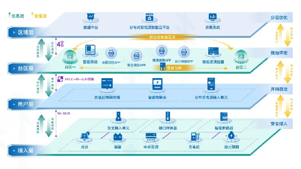 源荷平衡解決方案基于云管邊端體系架構,全環節貫通信息流和能量流,實現光儲充用協同管理。在云側,建設分布式新能源數智管理平臺,基于智能體及AI大模型技術實現光儲充用異質資源融合接入及智能管理。在邊側,內嵌基于安全、經濟、低碳運行的多模態就地化內外雙循環調控與實時滾動優化策略,研發聚合調控、電碳雙控等APP,支持多形態臺區終端跨平臺運行,提升多元負荷就地調控能力。在端側,研發并應用多品類安全接入設備,支持差異化環境下的光儲充用標準化接入,采用即插即用、快速組網的父子集群IP化的多跳網狀網技術,實現數據安全高效傳輸。
