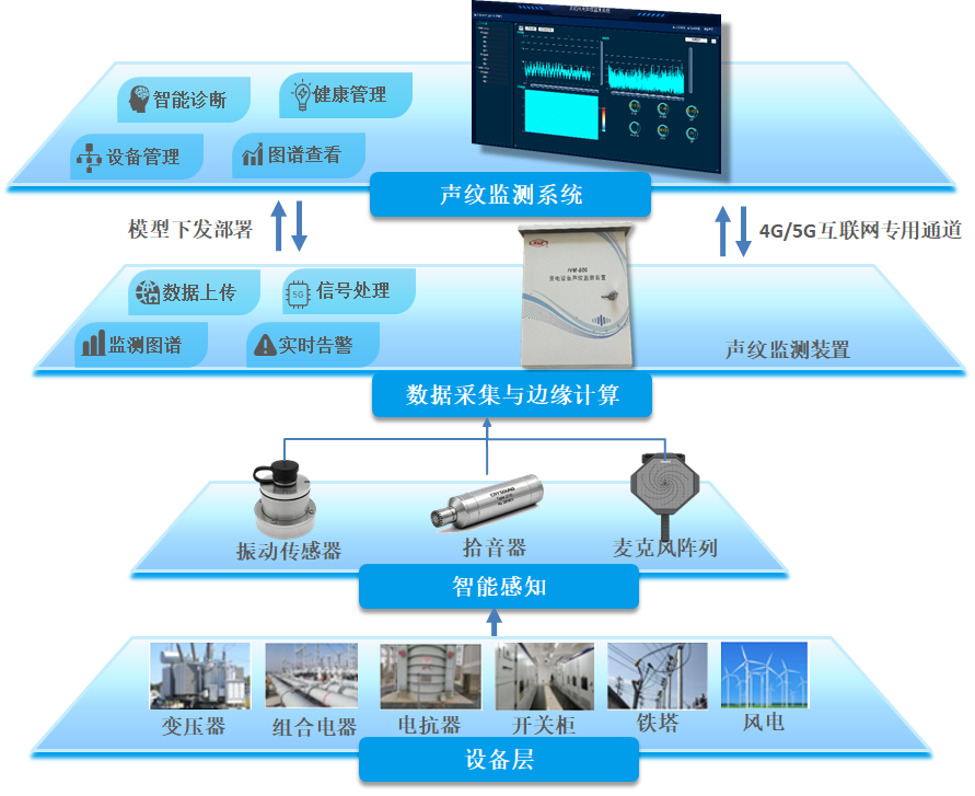 相較于傳統的基于電氣、化學、光學特征的檢測方法,變電設備聲紋監測裝置通過先進的聲學監測技術,實現對變電設備工作聲音的精準感知與實時檢測,提供設備全生命周期的變化監測曲線,幫助用戶及時完成設備故障排查和預測性維護,為正確運檢決策做出輔助研判。