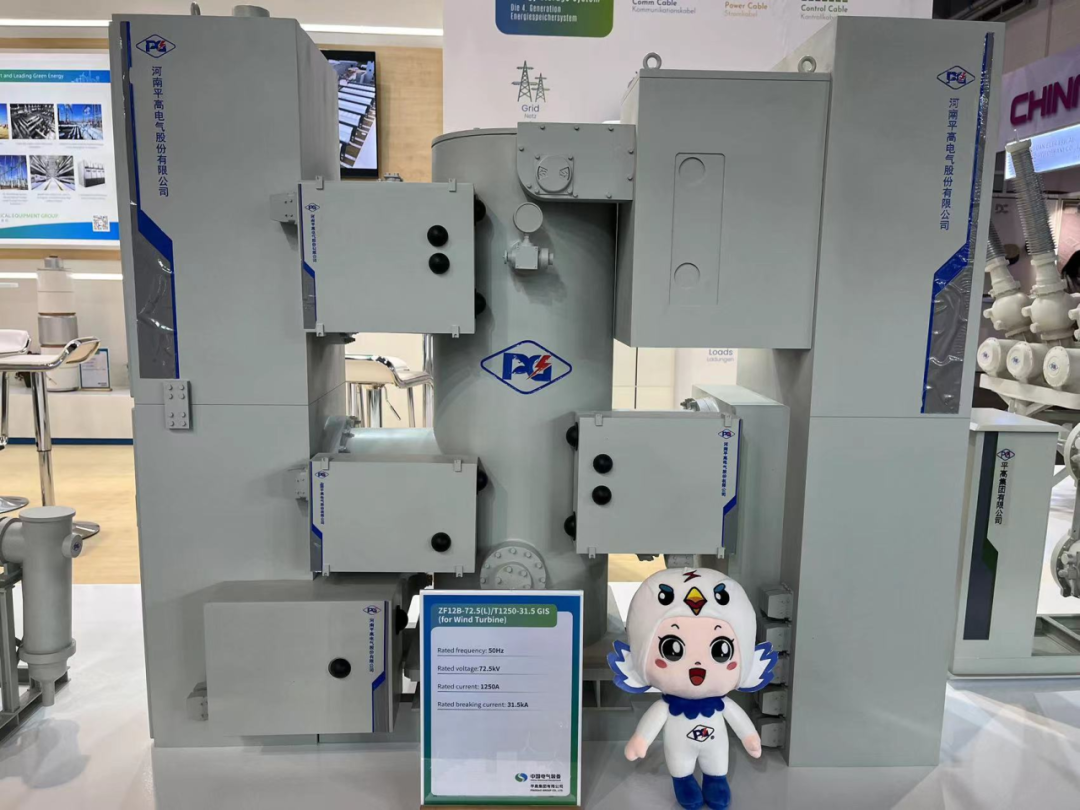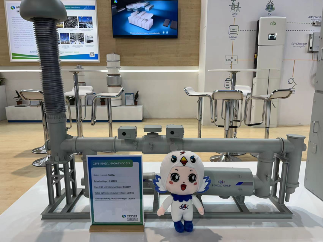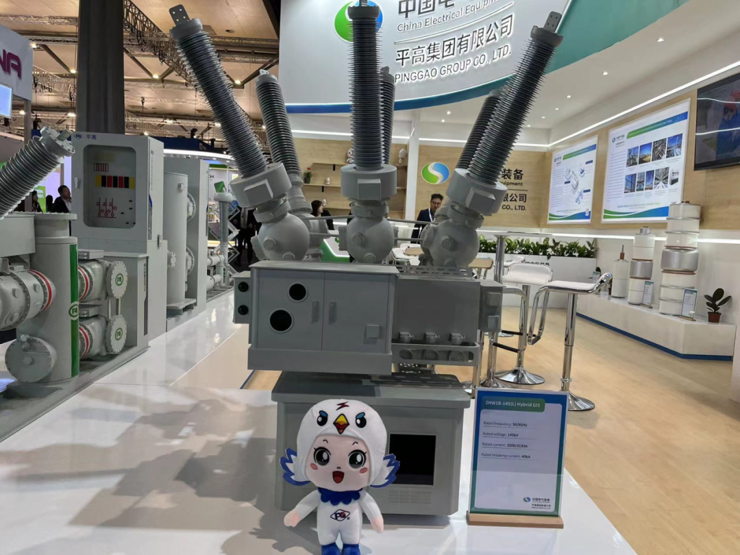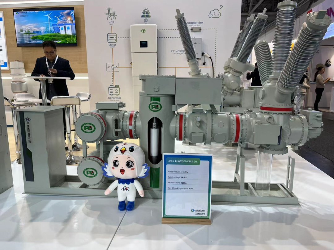 為積極參與全球新型電力系統建設,推動全球電網綠色發展,平高集團聚焦“綠色環保,智能制造”主題,重點展出了真空滅弧室、72.5千伏GIS(風機用)、145千伏環保GIS產品、145千伏SF6 HGIS產品、±550千伏直流GIS、光儲充一體化設備及配套商業場景模型,充分展現了平高集團科技創新、智能制造實力及支持全球新型電力系統建設和綠色發展的能力。