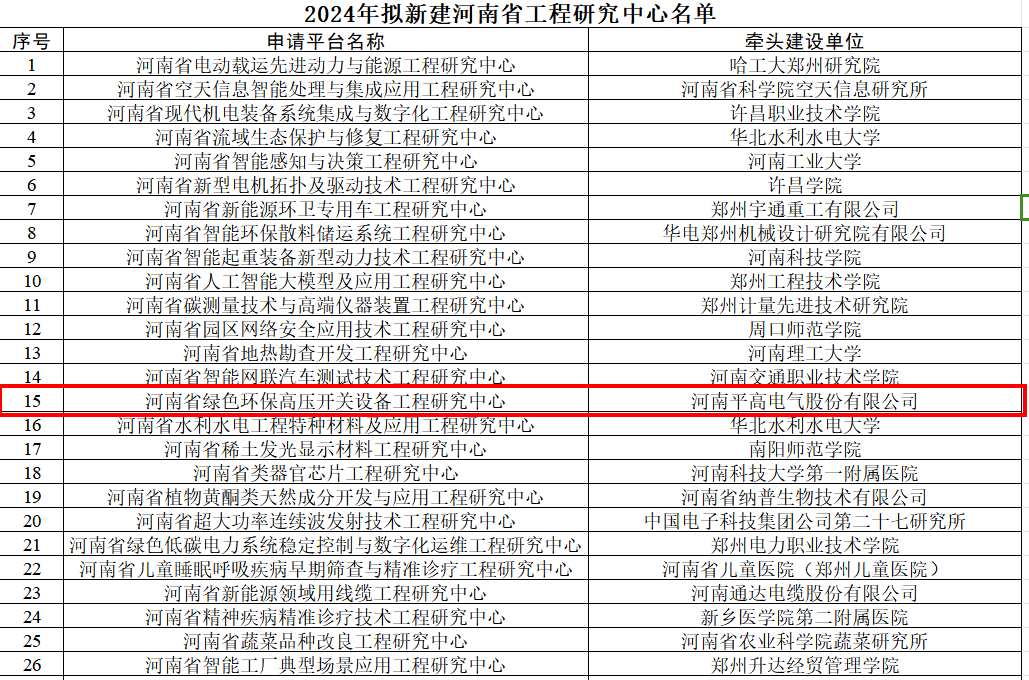 近日,河南省發展和改革委員會發布的“2024年度擬新建河南省工程研究中心”名單公示結束,由平高電氣牽頭建設的“河南省綠色環保高壓開關設備工程研究中心”成功獲批,這標志著公司在科技體制改革、科技創新體系建設方面邁向一個新臺階。