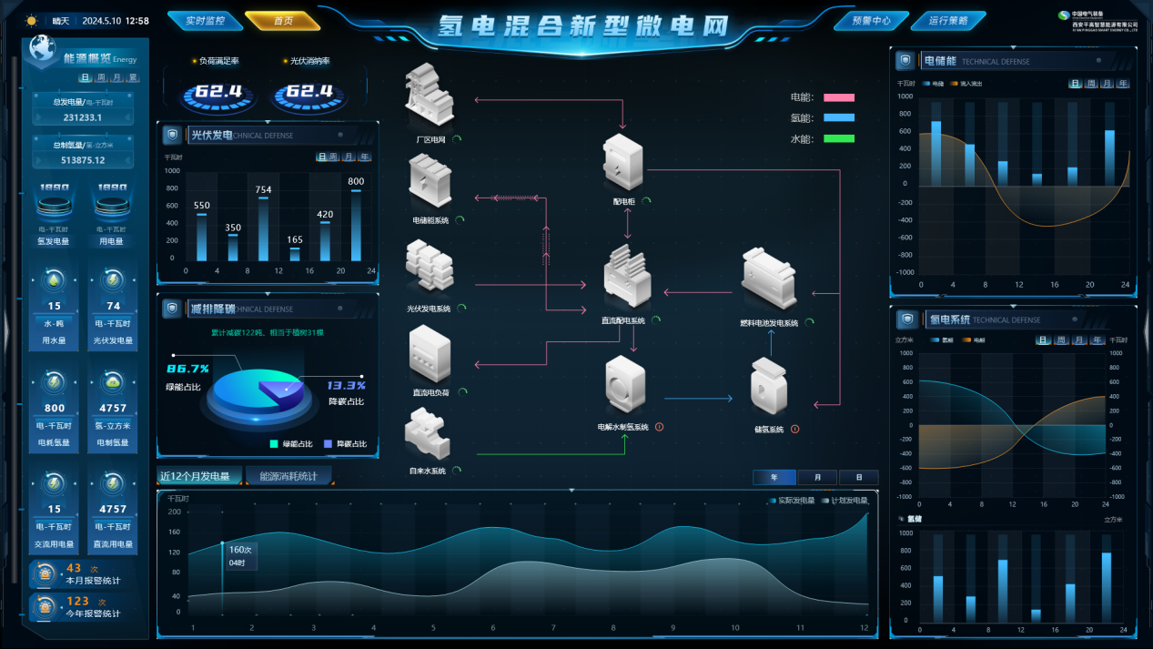 近日,平高集團所屬西安平高獨立研制的預裝式氫電互動系統在平高集團智慧能源科技創新基地完成現場調試工作。該系統采用預裝式、模塊化設計,集成電源平臺、電解水制氫、燃料電池、能量控制器等設備于一體,打造綜合供能內循環體系,可以將源源不斷的不穩定清潔能源進行制氫儲能,并在用戶需要時進行氫供應或氫發電,實現電、氫、熱的穩定輸出和就地利用,該示范項目是平高集團落實國家雙碳戰略,探索電氫多元耦合發展的積極實踐。
