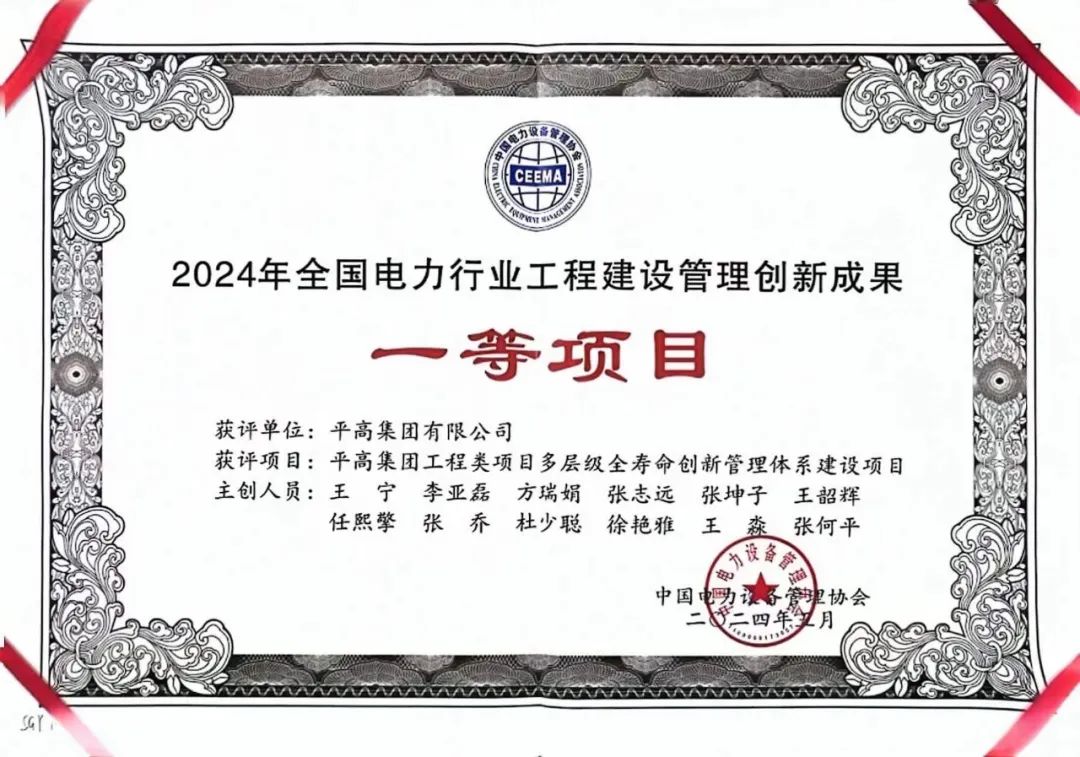 近日,中國電力設備管理協會公布了“2024年全國電力行業工程建設管理創新成果”獲獎名單,“平高集團工程類項目多層級全壽命創新管理體系建設項目”榮獲一等獎。