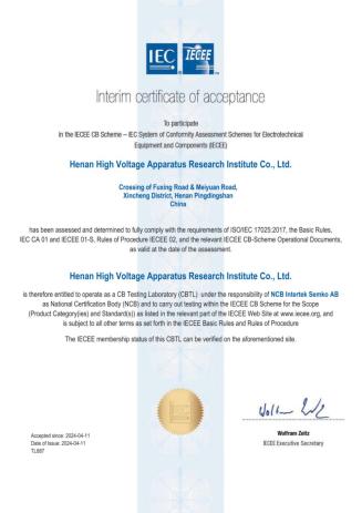 近日,平高集團所屬企業河南省高壓電器研究所有限公司(以下簡稱“研究所”)獲得國際電工委員會電工產品合格檢測與認證組織(IECEE)建立的電工產品安全檢測結果全球互認體系(CB)認證,成為瑞典Intertek Semko AB國家認證機構(NCB)授權認證的CB檢測實驗室(CBTL)。
