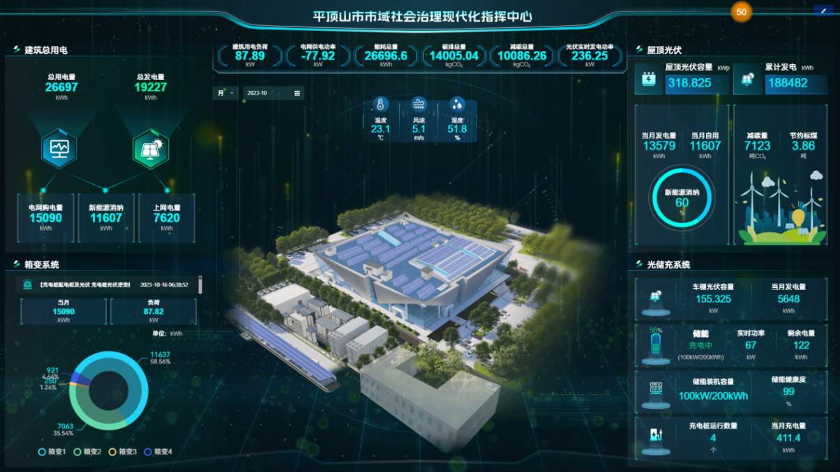 據了解,此次獲獎項目以平頂山市市域社會治理現代化指揮中心為依托,通過建設綠色供電系統、光儲充微網系統及智慧管控系統,開展智能配電運維,打造“綠色低碳、能源物聯”的新型智慧化場館建筑。項目已于2022年12月投運,累計產生綠電575471千瓦時,減少二氧化碳排放474.2噸,實現指揮中心“節能降碳、智能用電、智慧物聯”,建造鷹城公共建筑節能降碳標桿示范工程。