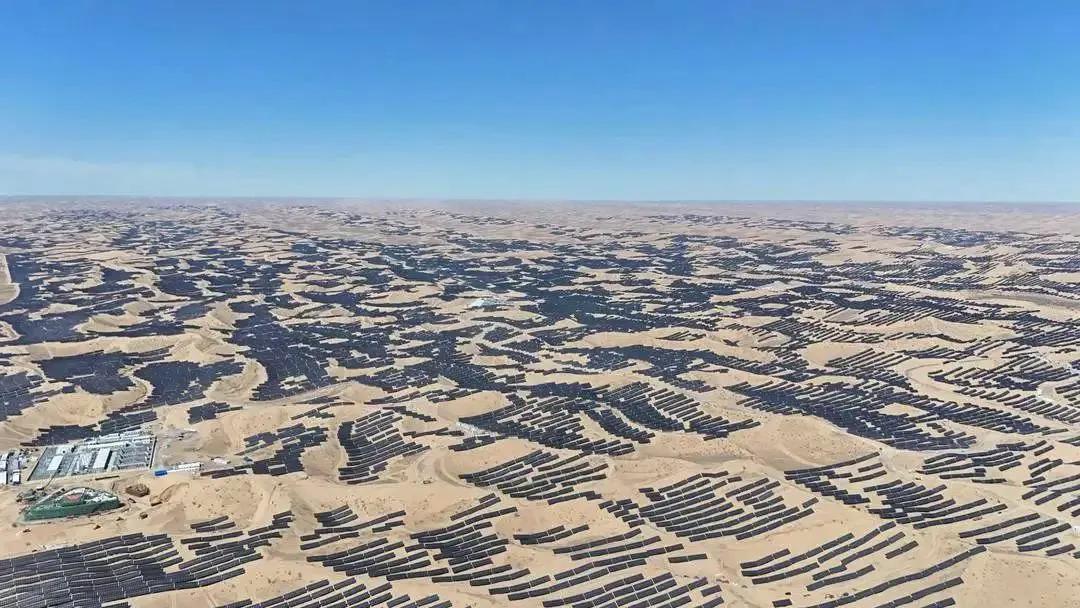新疆米東350萬千瓦光伏項目是國內單體容量最大的沙漠光伏項目,位于烏魯木齊市米東區北部沙漠,占地面積約20萬畝,利用小時數1740h,年發電量60.9億千瓦時,相當于300萬戶家庭一年的用電量。項目投運后,每年可節約原煤194.88萬噸,減少二氧化碳排放量607.17萬噸,對加快當地能源結構優化、推動電力市場建設具有重要意義。
