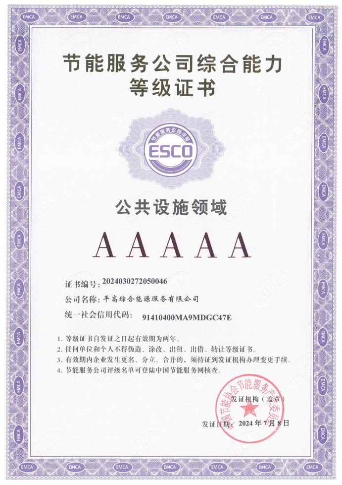 7月15日,中國節能協會服務產業委員會公布了節能服務公司綜合能力評定的結果,平高集團所屬平高綜合能源服務有限公司(以下簡稱“綜合能源公司”)獲得了節能服務公司綜合能力“公共設施AAAAA”級認證。