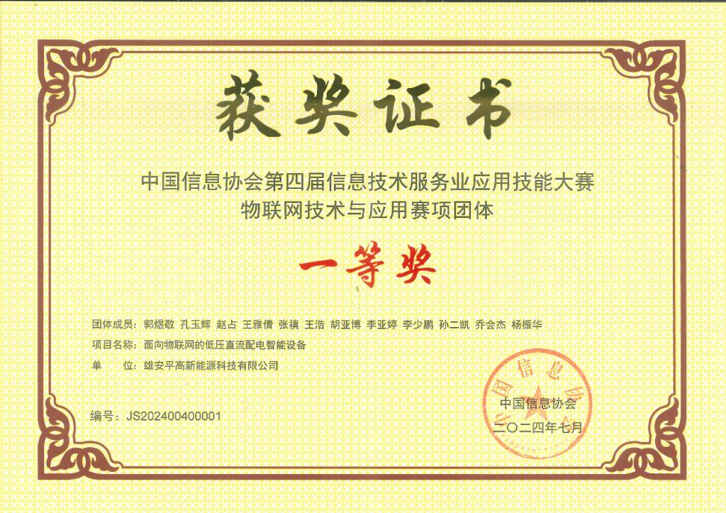 近日,中國信息協會在北京隆重舉辦了第四屆信息技術服務業應用技能大賽頒獎會,雄安平高新能源科技有限公司(以下簡稱“雄安平高”)憑借其在物聯網技術領域的創新應用,申報的《面向物聯網的低壓直流配電智能設備》項目脫穎而出,榮獲一等獎。這是繼2024年第六屆全國設備管理與技術創新成果一等獎后,雄安平高再次獲得的行業高度認可。