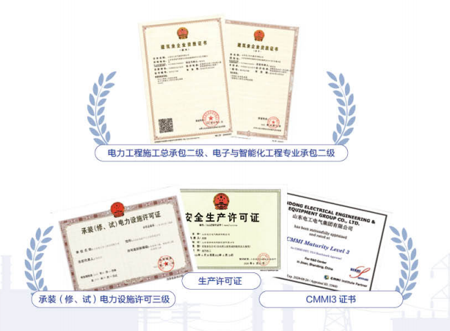 工程公司具備電力工程施工總承包二級、承裝(修、試)電力設施許可三級、電子與智能化工程專業承包二級、安全生產許可證、質量環境職業健康一體化認證、綜合能源服務認證、節能技術服務認證、合同能源管理服務認證、CMMI三級等資質。
