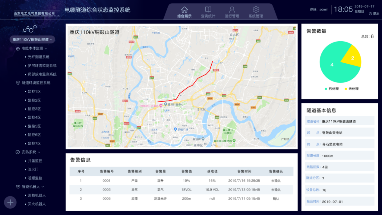 電纜隧道綜合監控系統由山東電工電氣所屬數字科技自主研制,通過國家級新產品鑒定,達到國際先進水平。該產品具有電纜線路及通道環境狀態綜合診斷、風險預警、差異化運維決策、老化評估、退役決策等智能化運維管控功能。產品先后在重慶江北110千伏電纜隧道綜合監控工程、西安東北部330千伏架空線路遷改落地工程等國家電網重點示范工程應用。