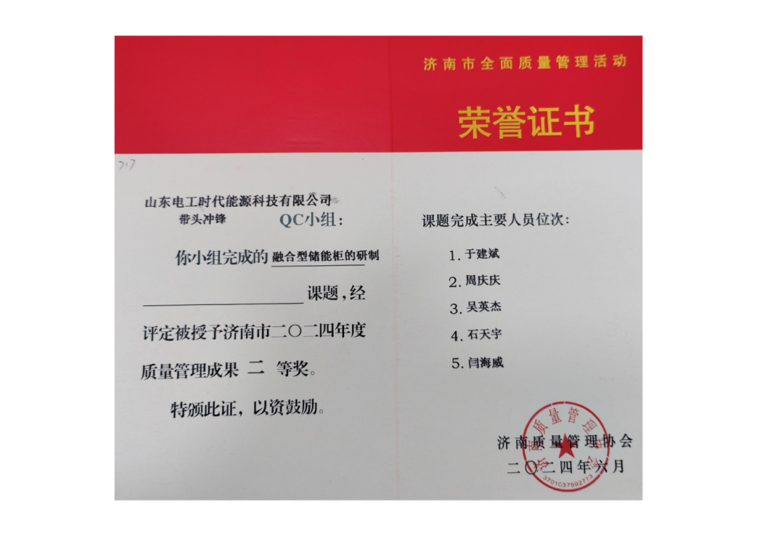近日,濟南質量管理協會發布《關于公布濟南市2024年度群眾性質量管理活動優秀成果、質量信得過班組的通知》,山東電工電氣所屬電工時代申報的《縮短儲能系統PACK前面板組裝時間》等五個QC成果分別獲得了一個一等獎、兩個二等獎、兩個三等獎。
