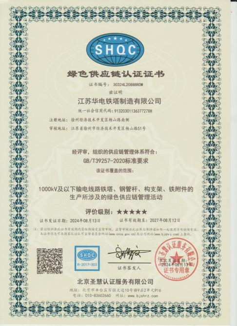 近日,江蘇華電鐵塔制造有限公司(以下簡稱“江蘇華電”)綠色供應鏈、綠色企業、綠色工廠評價管理體系經北京圣慧認證服務有限公司現場審核認證通過,標志著江蘇華電在貫徹落實新發展理念、建立健全綠色管理體系方面取得實質性成果。