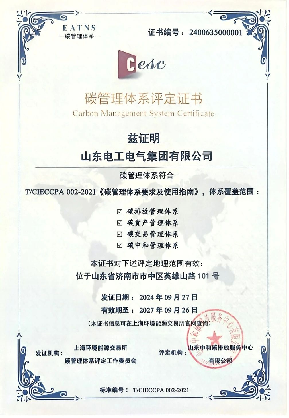 近日,山東電工電氣榮獲“EATNS碳管理體系評定證書”,標志著山東電工電氣成為山東省制造業首個通過碳管理體系貫標認證項目的示范單位。