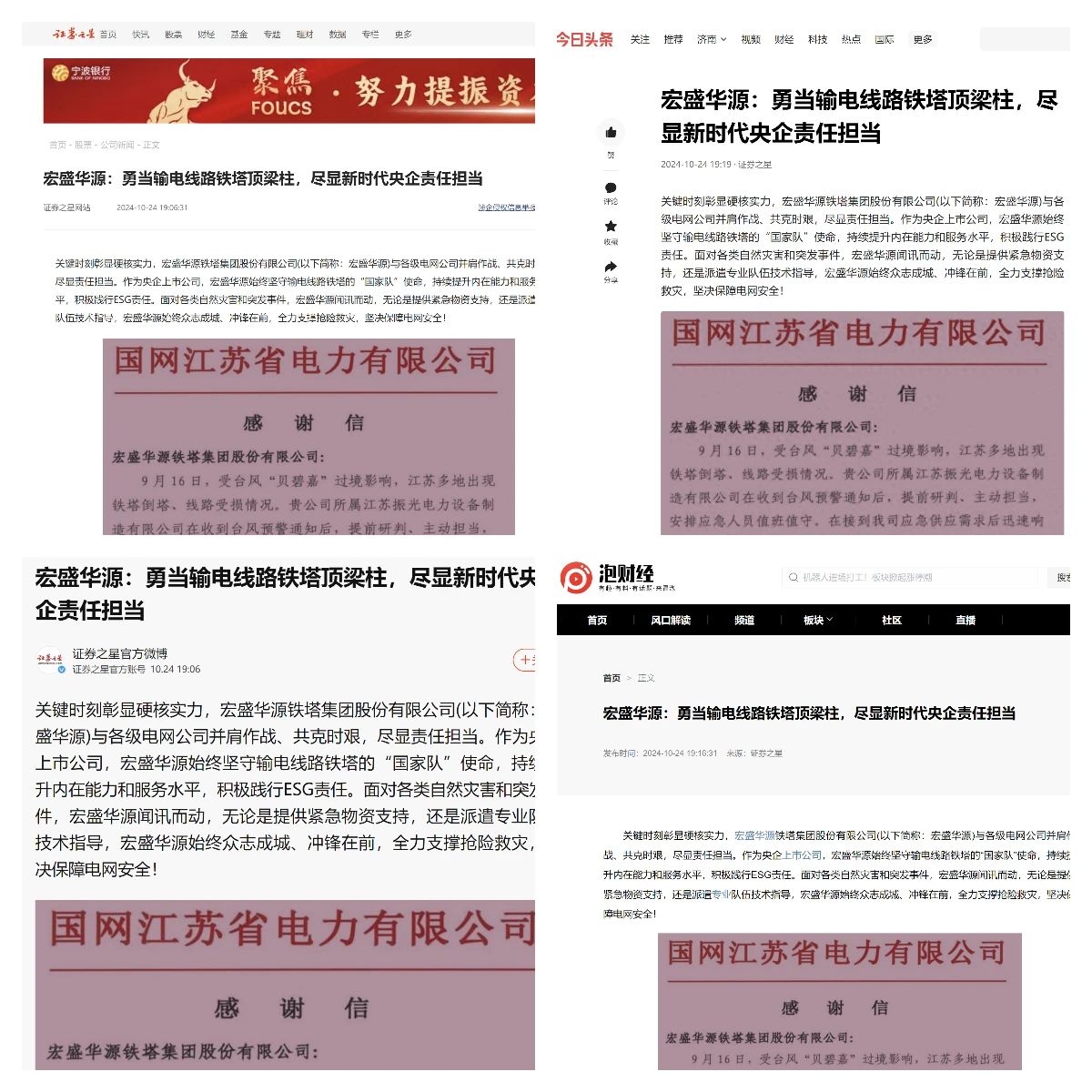 關鍵時刻彰顯硬核實力,近日,山東電工電氣所屬宏盛華源鐵塔集團股份有限公司(以下簡稱:宏盛華源)與各級電網公司并肩作戰、共克時艱,盡顯責任擔當,獲多家媒體報道。作為央企上市公司,宏盛華源始終堅守輸電線路鐵塔的“國家隊”使命,持續提升內在能力和服務水平,積極踐行ESG責任。面對各類自然災害和突發事件,宏盛華源聞訊而動,無論是提供緊急物資支持,還是派遣專業隊伍技術指導,宏盛華源始終眾志成城、沖鋒在前,全力支撐搶險救災,堅決保障電網安全。